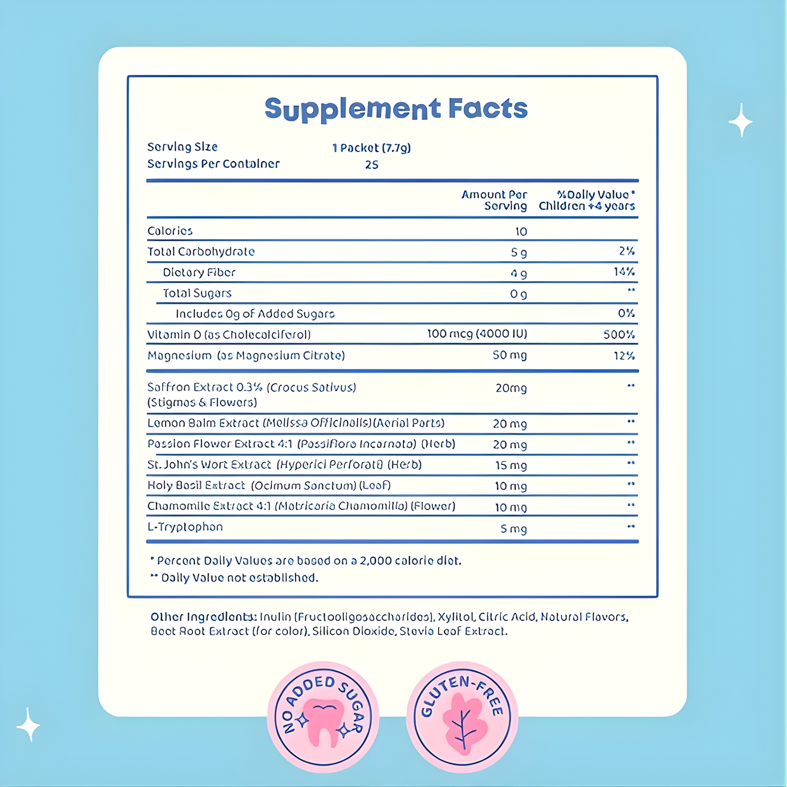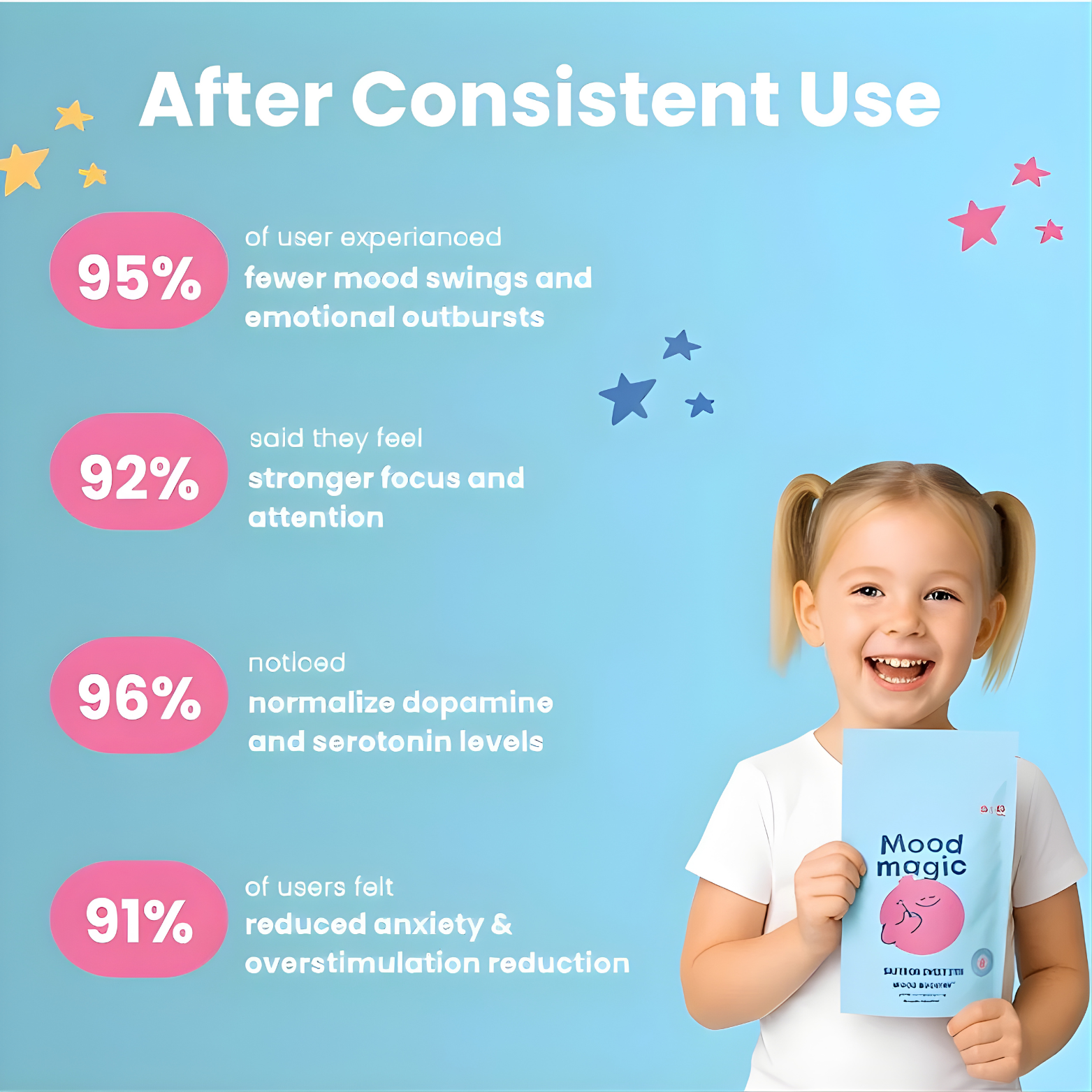 Mood Magic Sticks is natural powder made with saffron, GABA, St. John's Wort, and Passion Flower to help kids regulate big emotions and improve focus. They're sugar-free, vegan, and taste like natural berries. Think of them as daily support to help your child's racing mind slow down so they can handle feelings better.