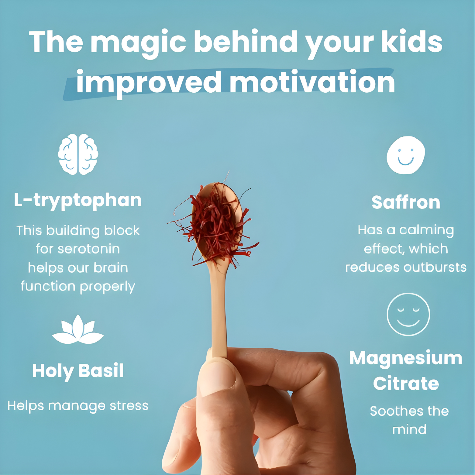 We use clinically-researched saffron extract - the same ingredient that works for adults but in kid-safe doses. Most children's supplements use generic herbs or don't have enough active ingredients to make a difference. Our formula combines four proven mood and focus ingredients in amounts that actually work, not just trace amounts.